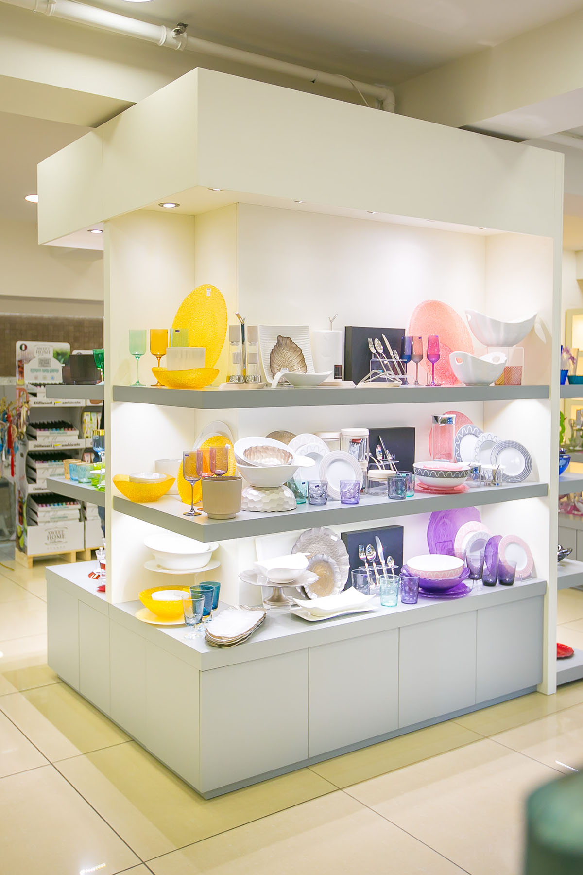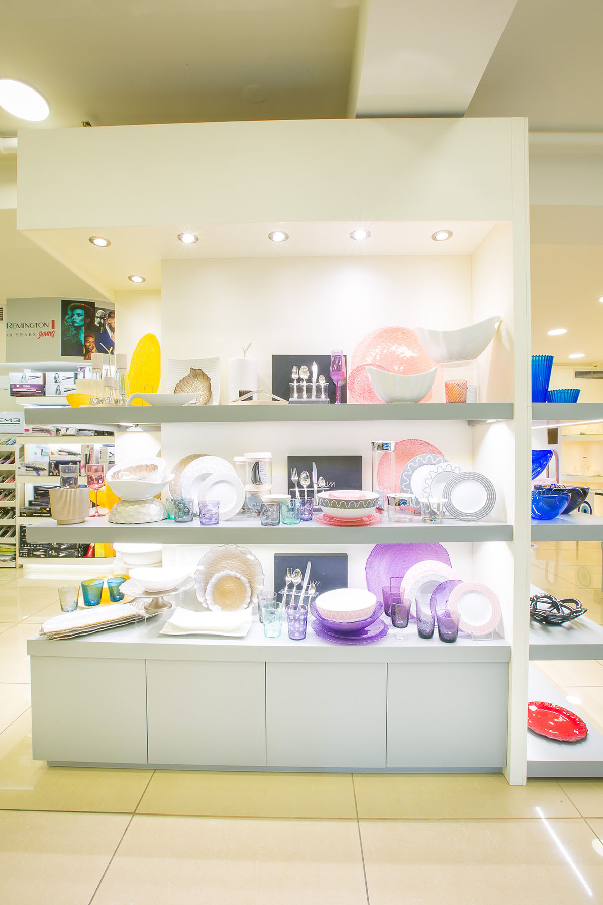 Το εκθετήριο κατασκευάστηκε εξολοκλήρου από λακαριστό MDF σε χρωματισμούς της εταιρίας με ράφια σε ευθείες γραμμές με κρυφό φωτισμό ενώ για τη σήμανση κατασκευάσαμε ακρυλικά γράμματα με διχρωμία.