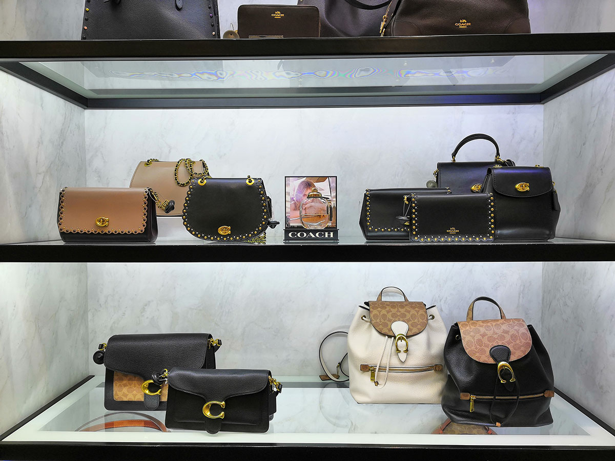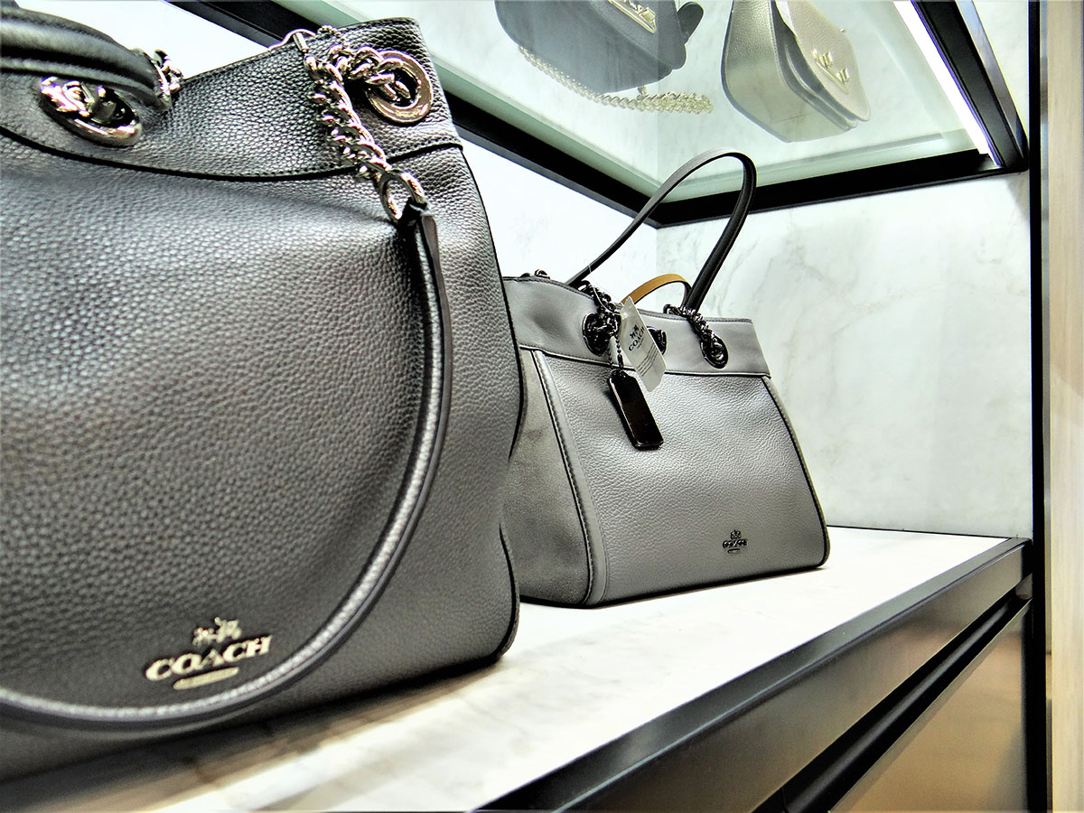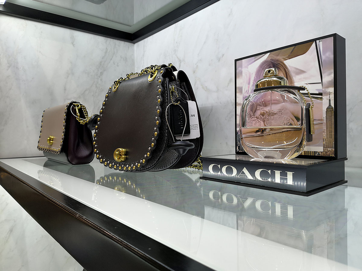 Για το φόντο προβολής των τσαντών COACH επιλέξαμε επιφάνειες λευκού μαρμάρου της κορυφαίας στο κόσμο εταιρίας CLEAF. Μελετήσαμε επίσης με ιδιαίτερη προσοχή τον φωτισμό της κατασκευής προκειμένου να μην υπάρχουν σκιάσεις στις επιφάνειες μαρμάρου αλλά και να επιτύχουμε το αρτιότερο δυνατό αποτέλεσμα σε ότι αφορά τη προβολή των τσαντών.
