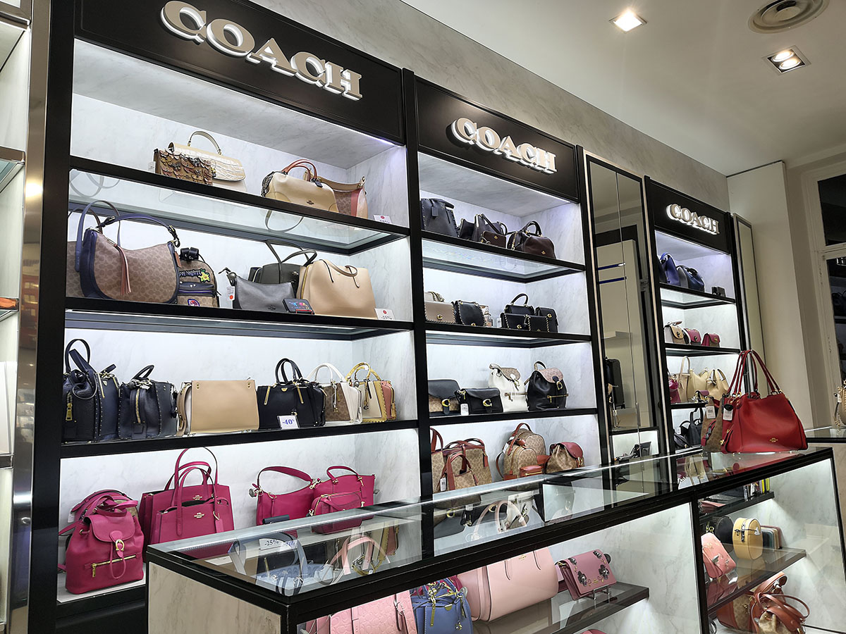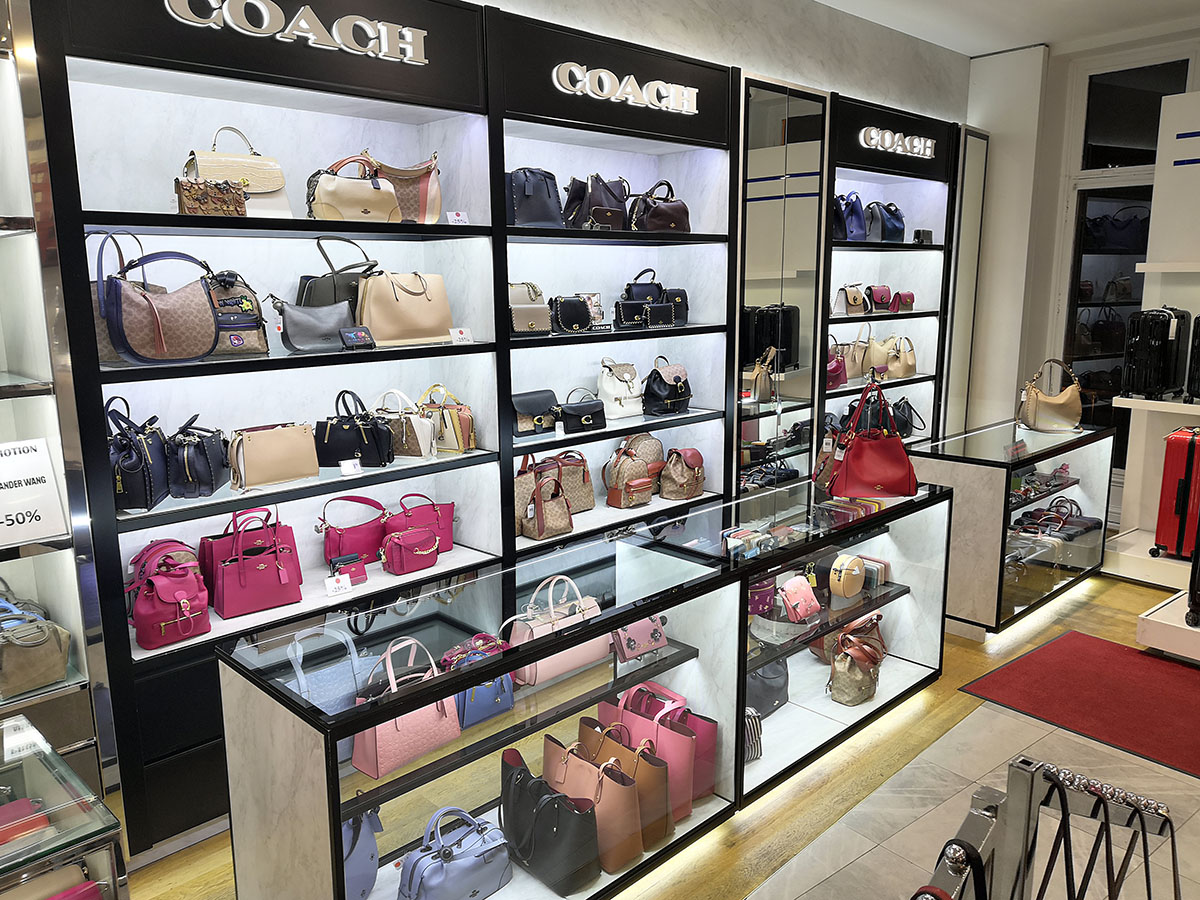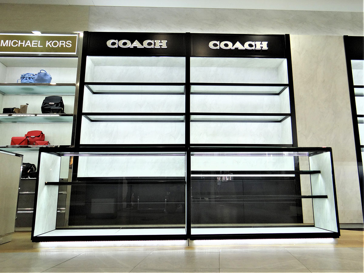 Κατά το σχεδιασμό του project αποφασίσαμε να χρησιμοποιήσουμε μαύρα μεταλλικά στοιχεία σε συνδυασμό με επιφάνειες απόχρωσης μαρμάρου που συνάδουν στο branding του οίκου Coach. Για τις μεταλλικές επιφάνειες επιλέξαμε την βαφή λάκας με ειδική επεξεργασία προκειμένου να έχουμε το καλύτερο δυνατό φινίρισμα. Τα προϊόντα του οίκου προβάλλονται πάνω σε κρυστάλλινα ράφια με μαύρο μεταλλικό σκελετό και φωτίζονται από ειδικά προφίλ led 4000Κ. Για την ενσωμάτωση των προφίλ εφαρμόστηκε περιμετρική βαφή στα κρύσταλλα. Για την σήμανση COACH κατασκευάσαμε 3D ανάγλυφα γράμματα με baclit φωτισμό πάνω σε μαύρη λακαριστή επιφάνεια. Ο σχεδιασμός και η κατασκευή του project εγινε εξ ολοκλήρου από την εταιρία μας και παραδόθηκε εντός 30 ημερών από το σηνεργείο μας στη περιοχή του Λούβρου στο Παρίσι.