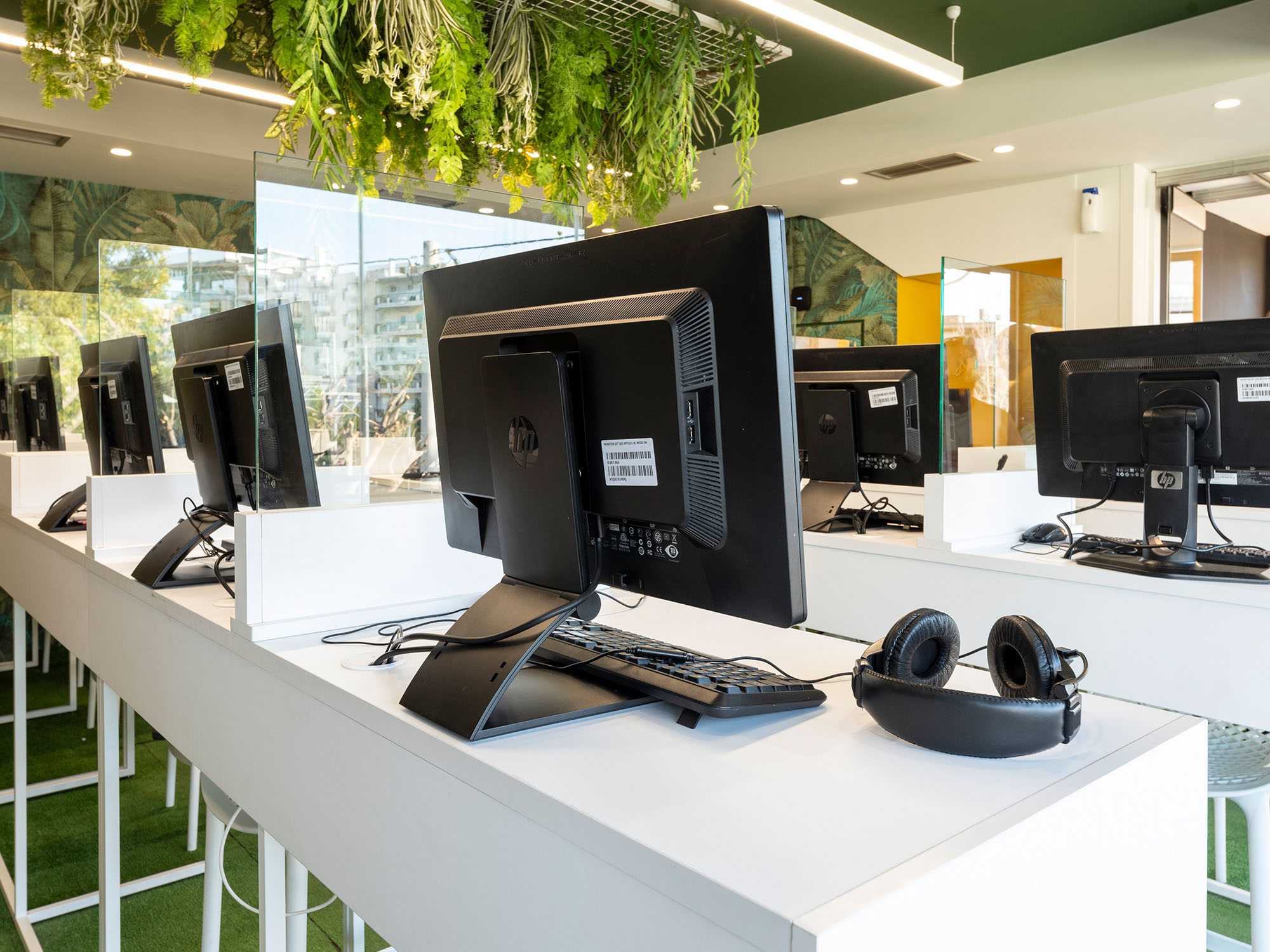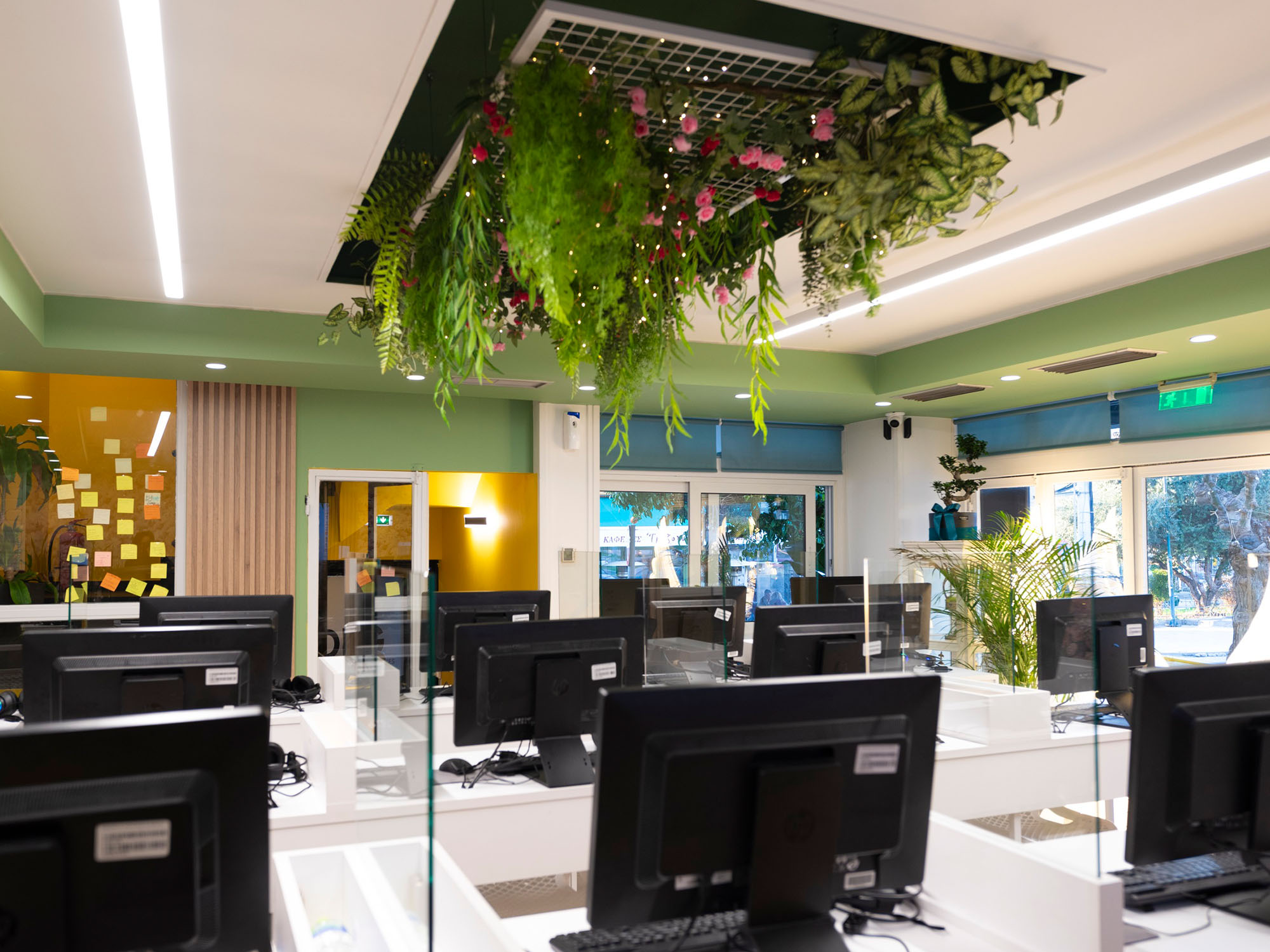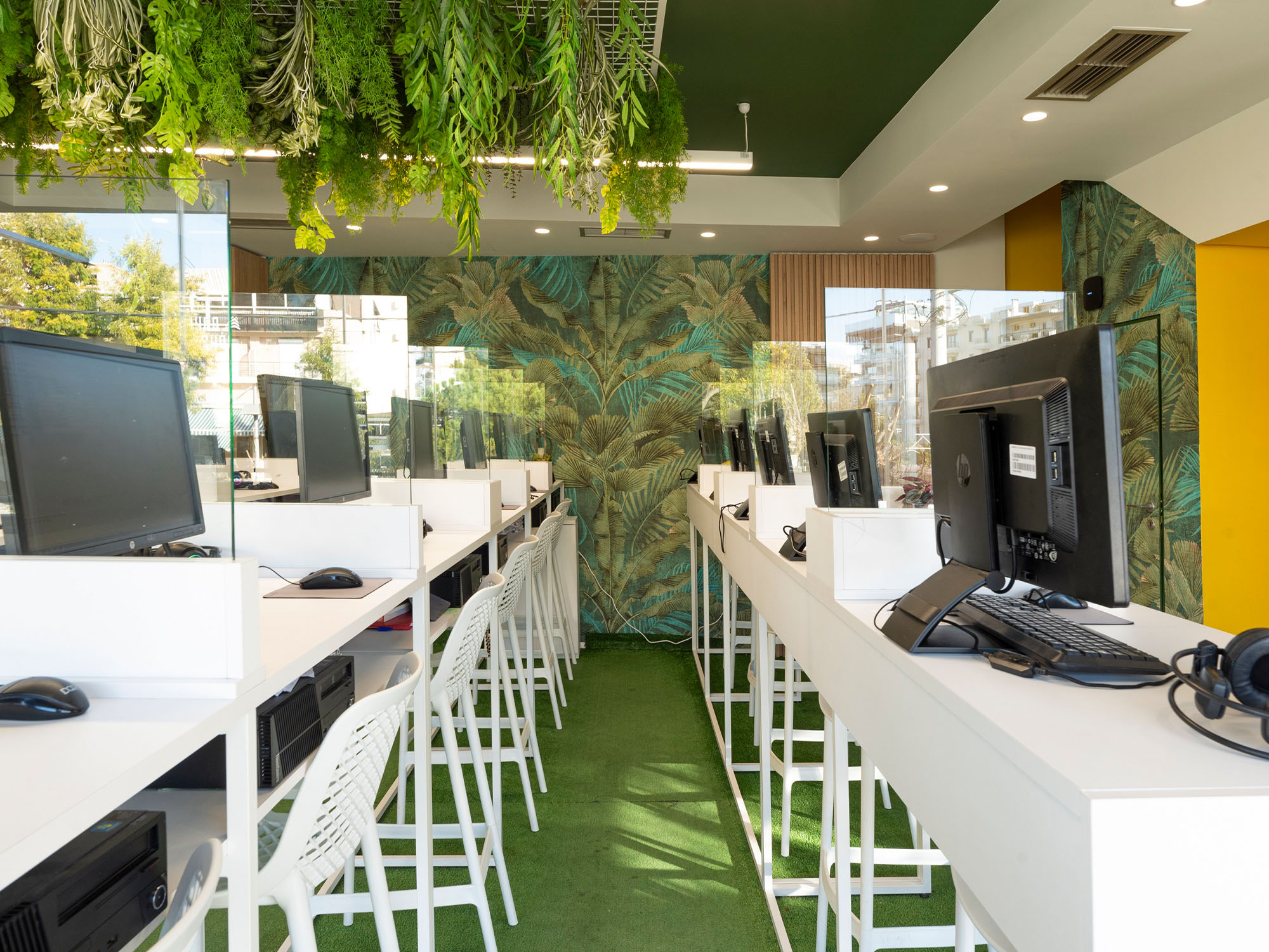Σε ότι αφορά τη διαρύθμιση των 3 επιπέδων, σε κάθε έναν τοποθετήθηκαν δυο θέσεις manager ενώ σχεδιάστηκαν και κατασκευάστηκαν 12 ως 15 θέσεις εργασίας οι οποίες εξυπηρετούνται από custom made υπερυψωμένα γραφεία. Σε κάθε επίπεδο σχεδιάστηκε εξαρχής και τοποθετήθηκε η απαραίτητη καλωδίωση ισχυρών και ασθενών ρευμάτων για το χώρο και για τις θέσεις εργασίας.