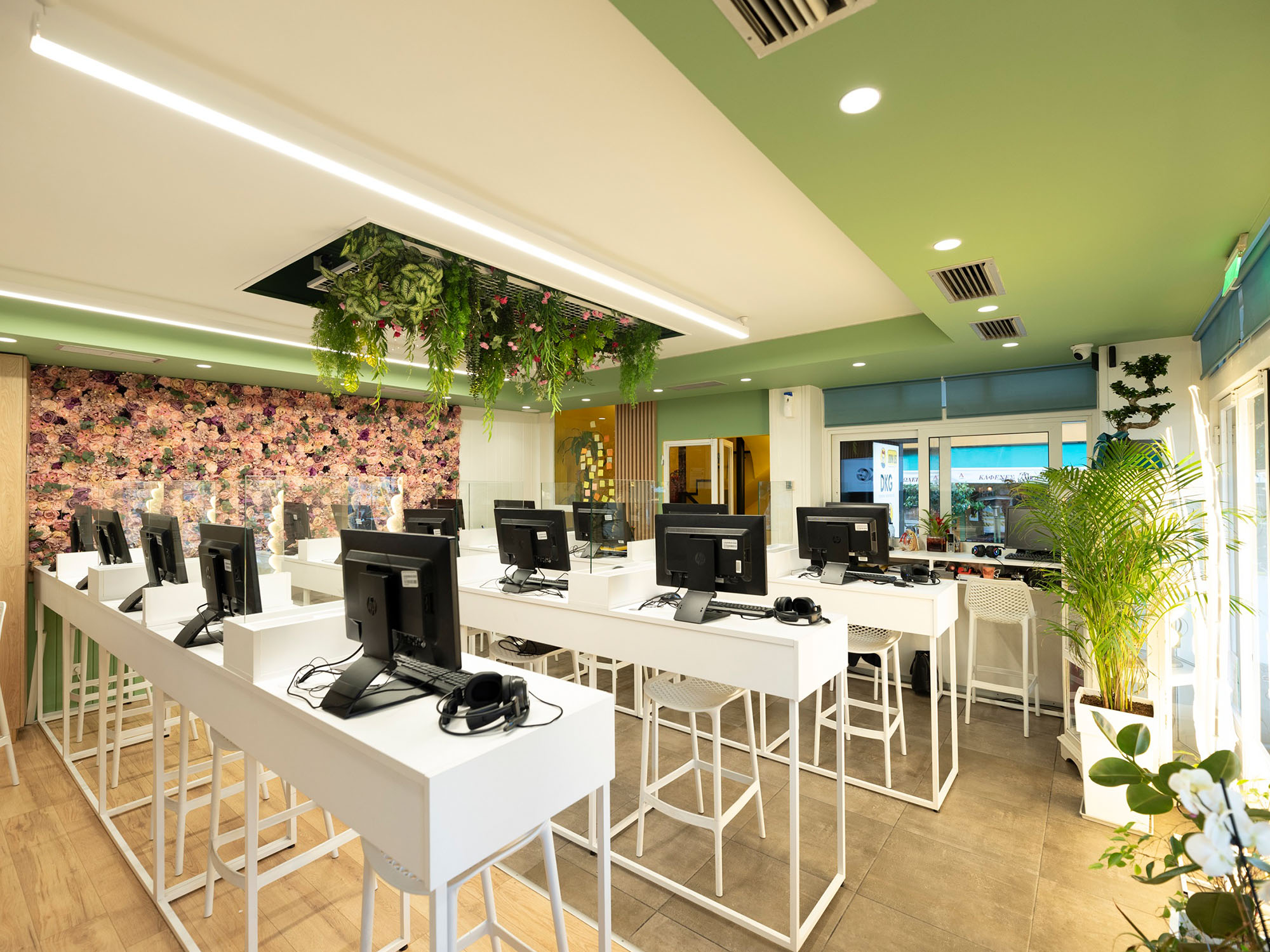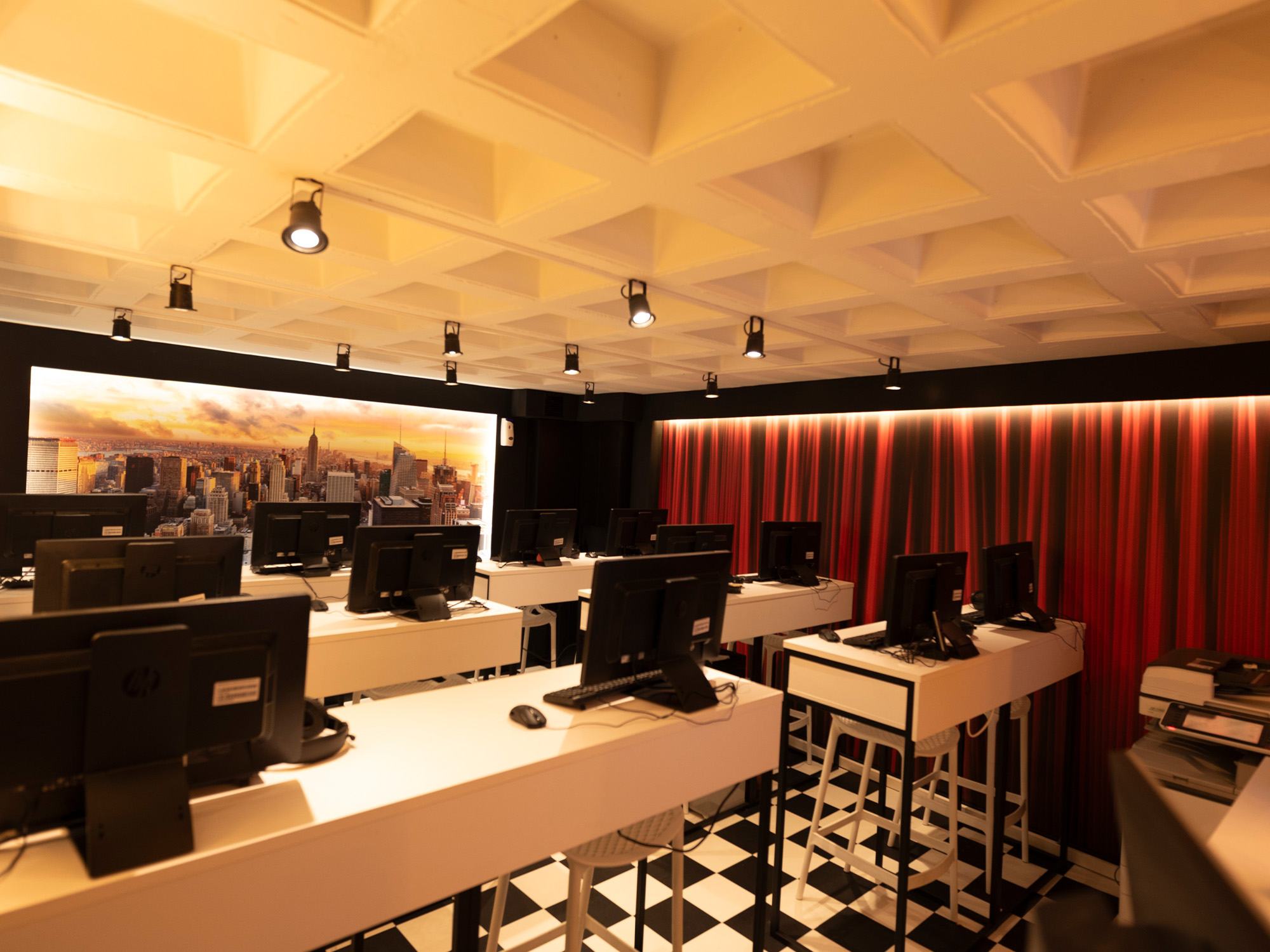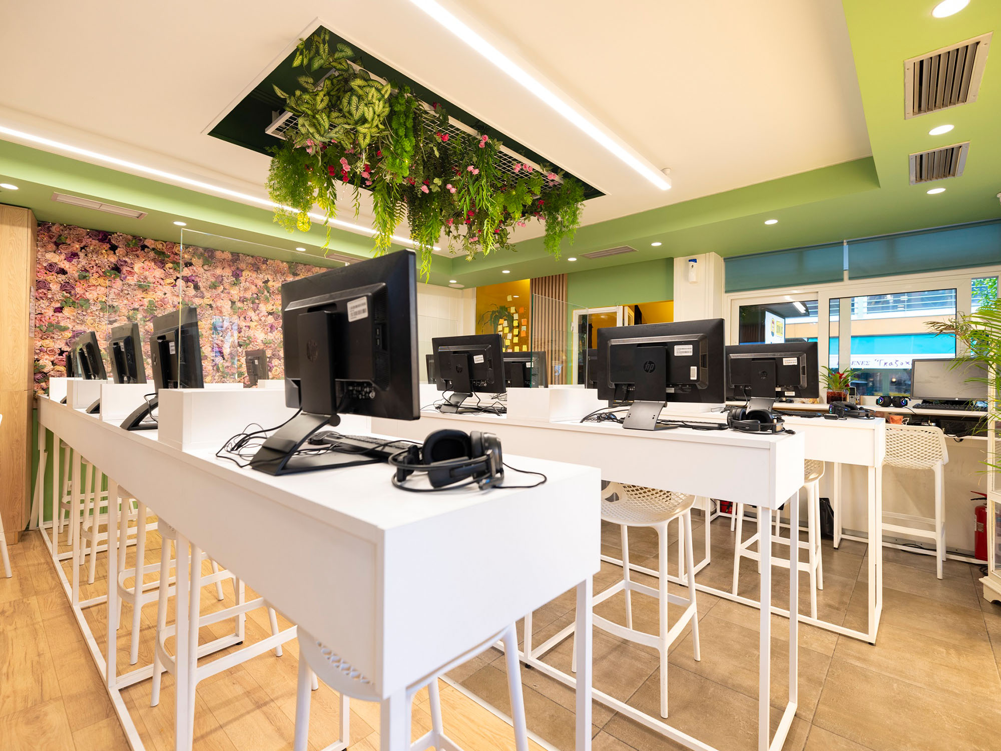Σε ότι αφορά τη διαρύθμιση των 3 επιπέδων, σε κάθε έναν τοποθετήθηκαν δυο θέσεις manager ενώ σχεδιάστηκαν και κατασκευάστηκαν 12 ως 15 θέσεις εργασίας οι οποίες εξυπηρετούνται από custom made υπερυψωμένα γραφεία. Σε κάθε επίπεδο σχεδιάστηκε εξαρχής και τοποθετήθηκε η απαραίτητη καλωδίωση ισχυρών και ασθενών ρευμάτων για το χώρο και για τις θέσεις εργασίας.