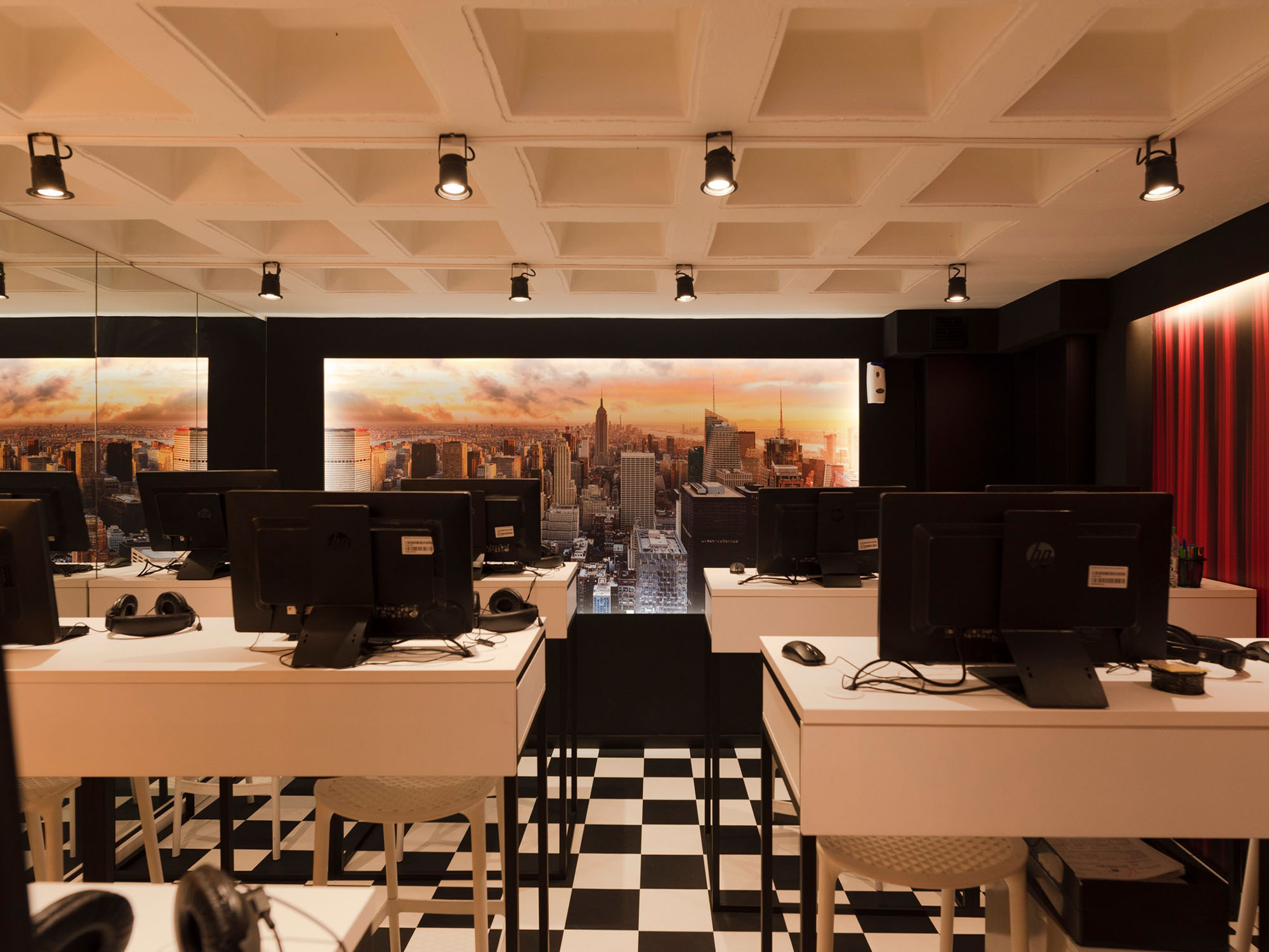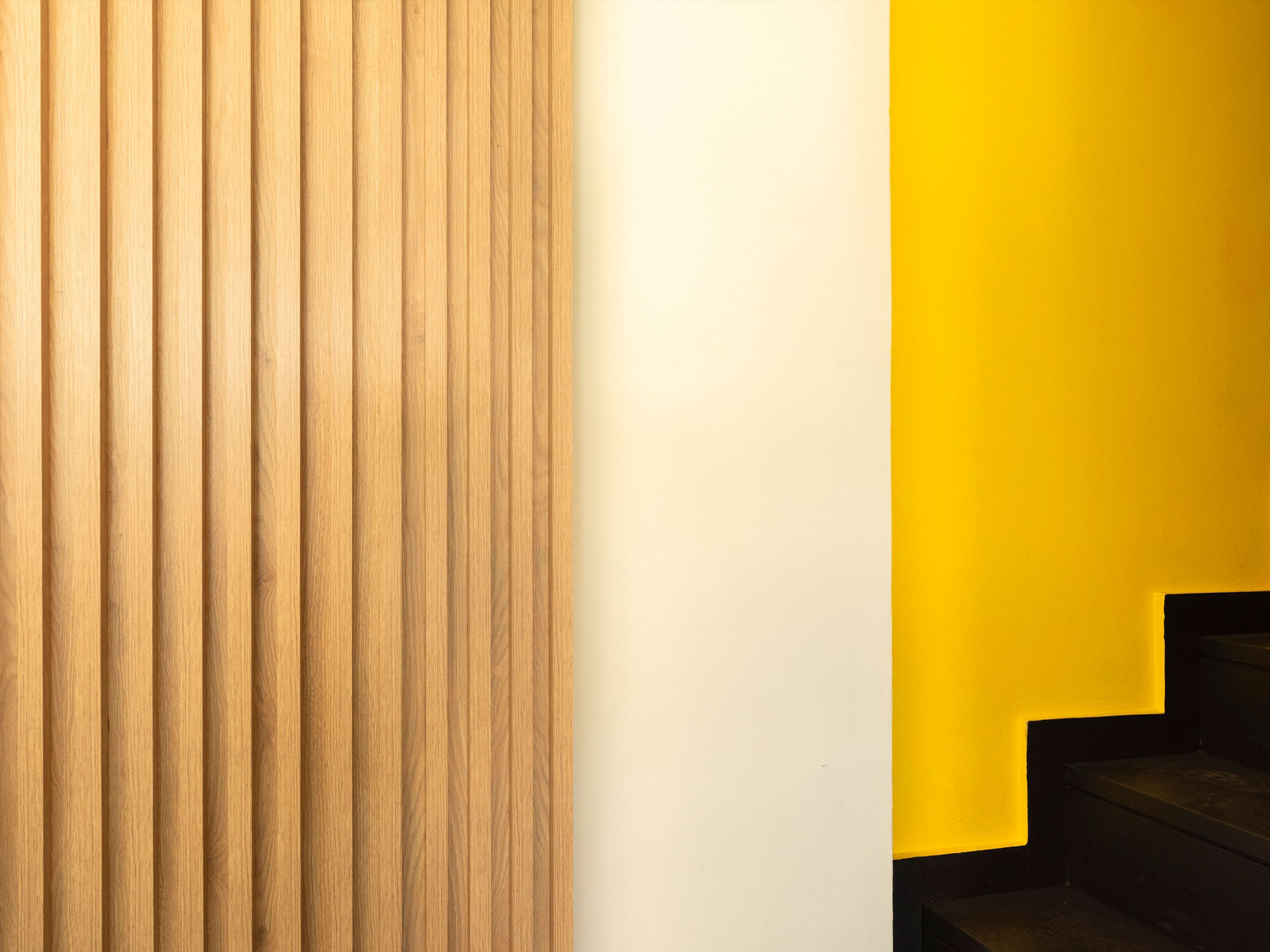 Στις εξωτερικές όψεις του κτηρίου επισκευάστηκαν οι προϋπάρχουσες φθορές ενώ για τους χρωματισμούς επιλέχθηκαν χρώματα που παραπέμπουν σε UNDER CONSTRUCTION ύφος το οποίο τονίζεται επιπλέον και από τις εξωτερικές σημάνσεις του κτηρίου. Το ίδιο ύφος ακολουθεί και στο κλιμακοστάσιο του κτηρίου με έντονο το κίτρινο χρώμα στους τοίχους.