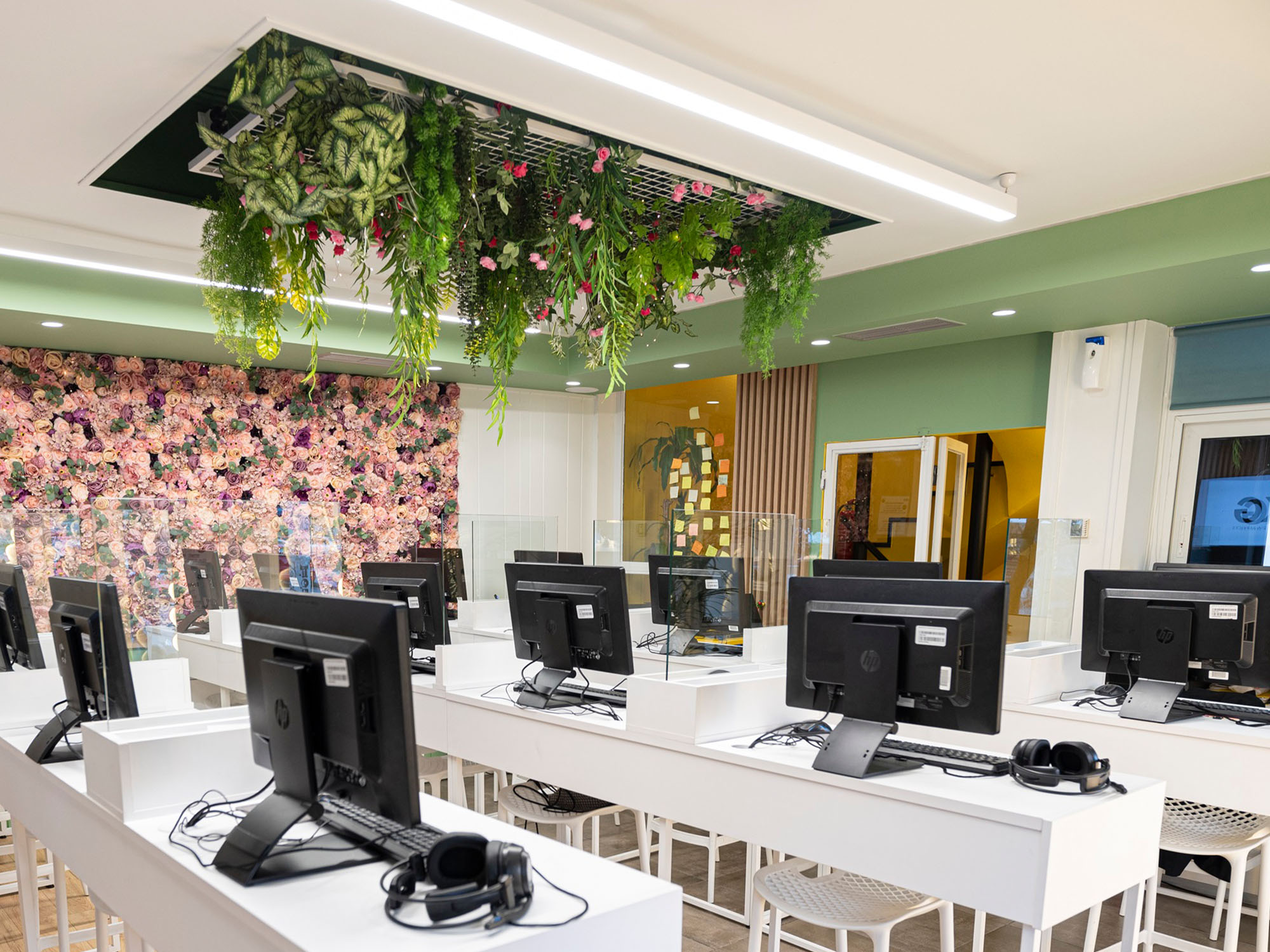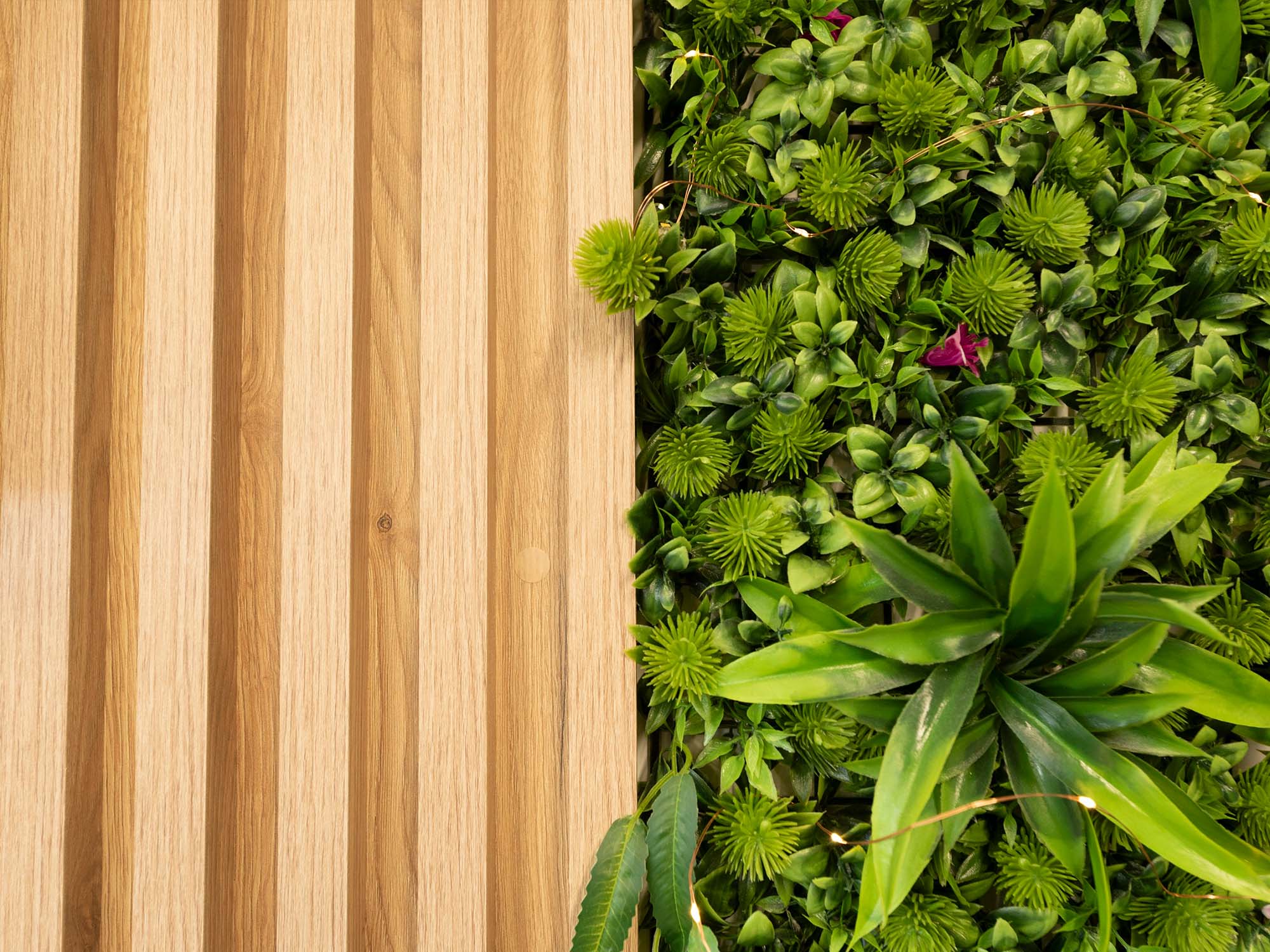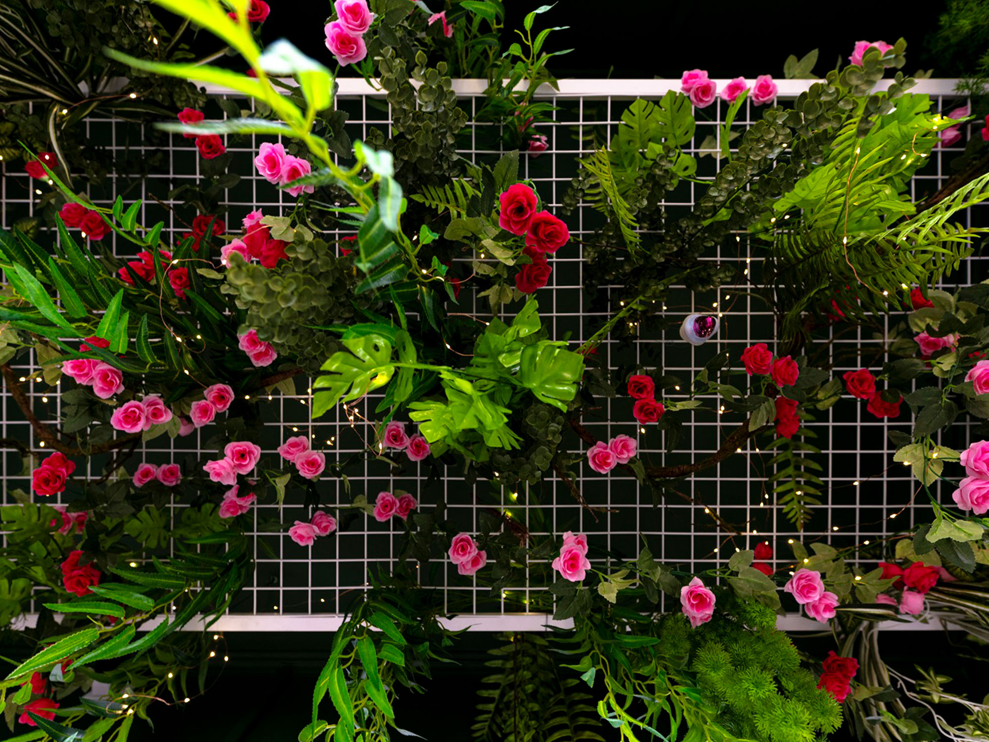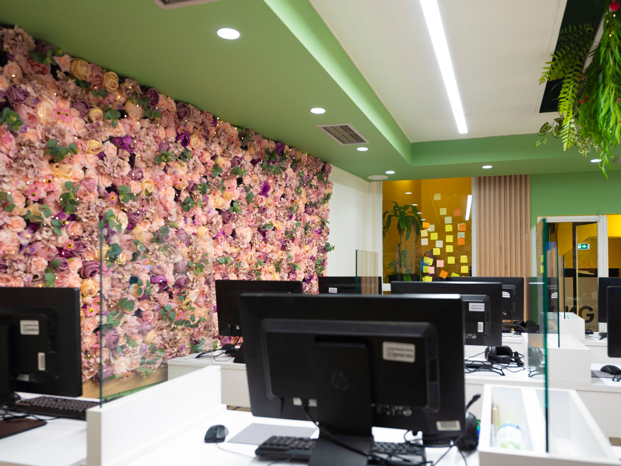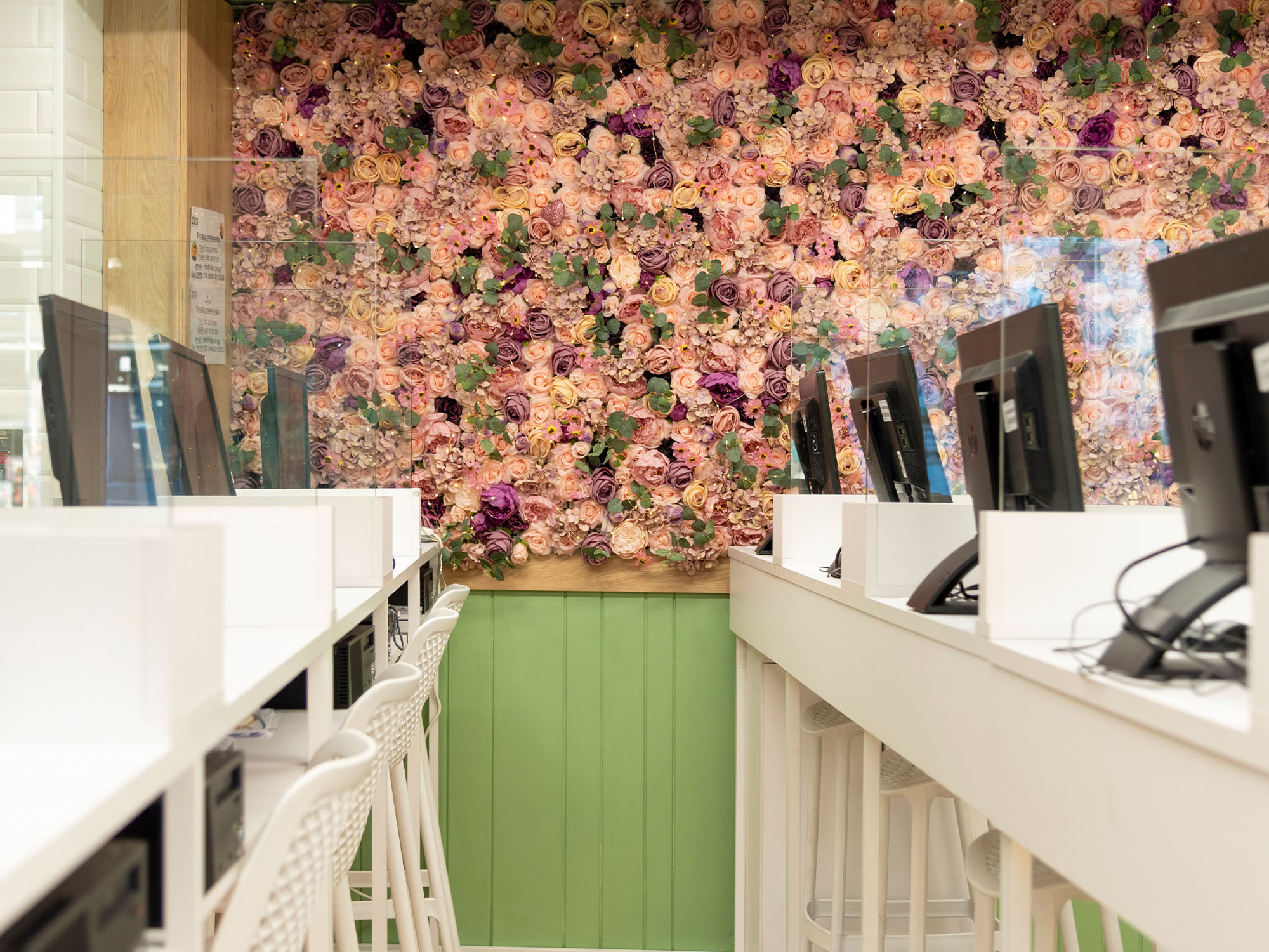 Στο επίπεδο του ισογείου που έχει έντονα floral στοιχεία τοποθετήθηκαν ανάλογης θεματολογίας ταπετσαρίες σε συνδυασμό με επενδύσεις με ξύλινα πηχάκια. Επιπλέον πάνελ τεχνητών λουλουδιών τοποθετήθηκαν στους τοίχους ενώ μια σύνθεση κρεμαστών λουλουδιών από την οροφή συμπληρώνει το χώρο.